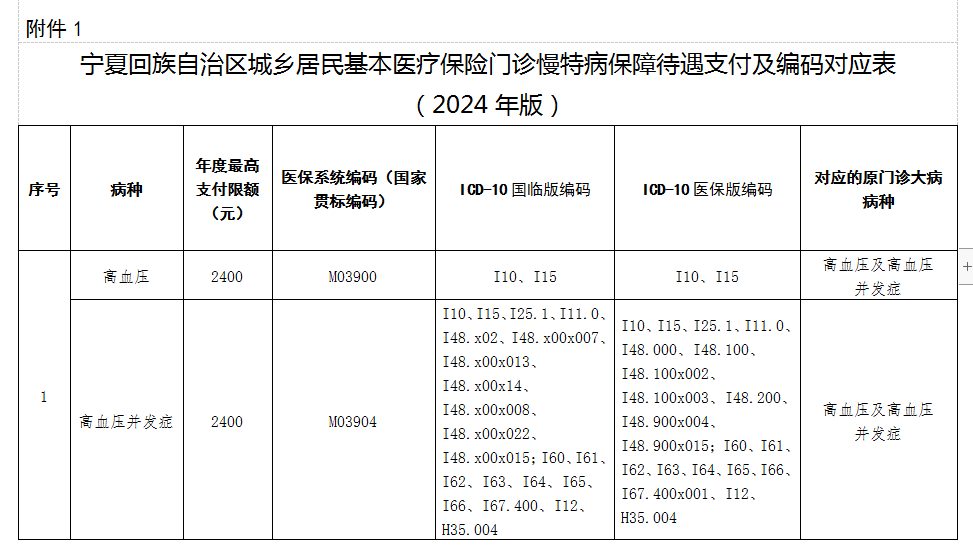 附件:1.宁夏回族自治区城乡居民基本医疗保险门诊慢特病保障待遇支付及编码对应表(2024年版)